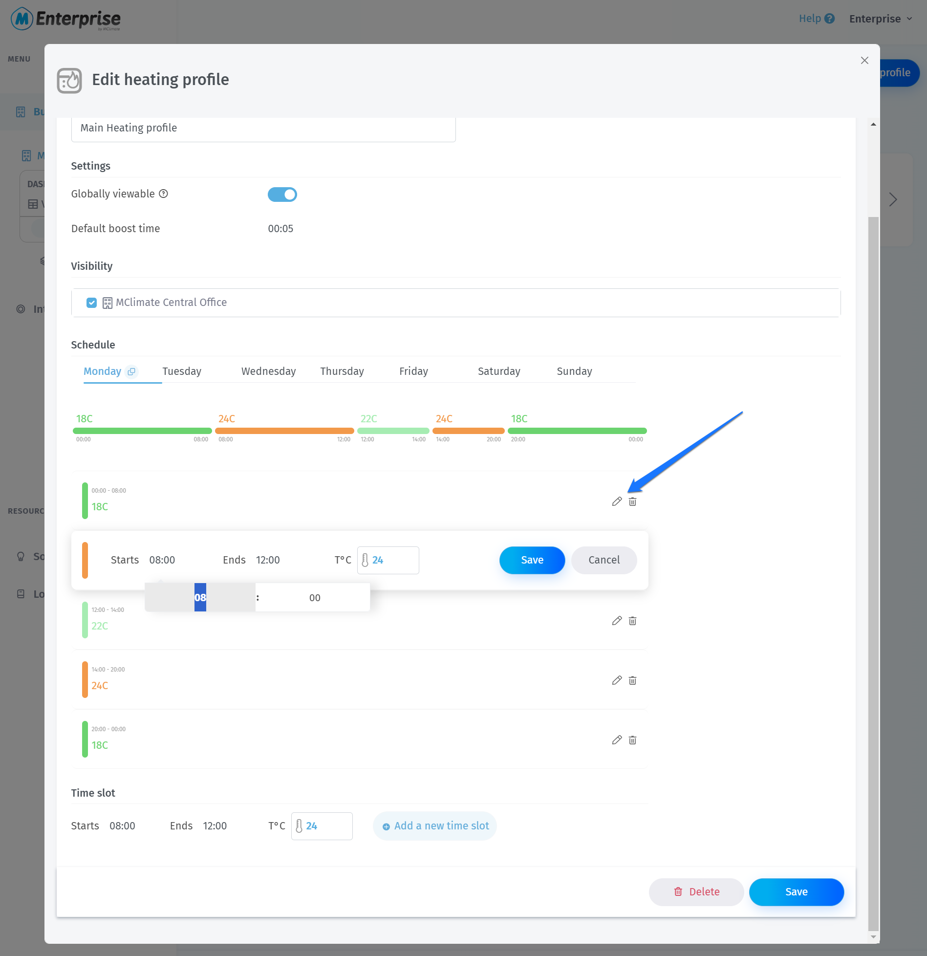 You are presented with a text box for the start and end time ranges in addition to the target temperature. Once you have entered your desired time range and temperature, click on the Add a new time slot button and you will create it. Do this for as many intervals as you require depending on your profile requirements.
